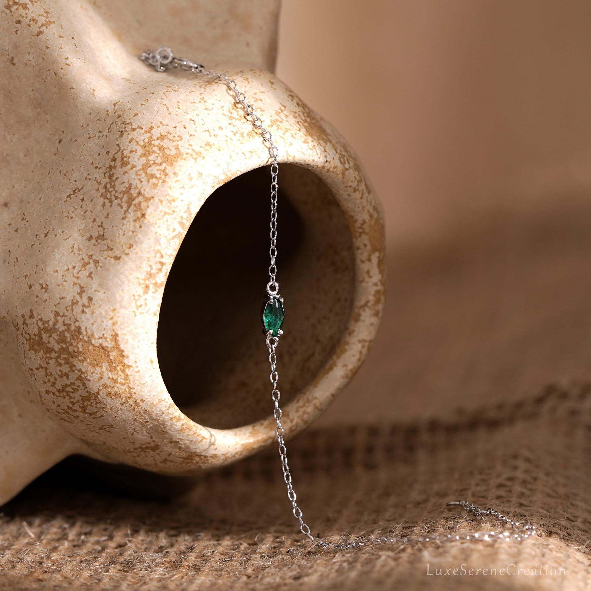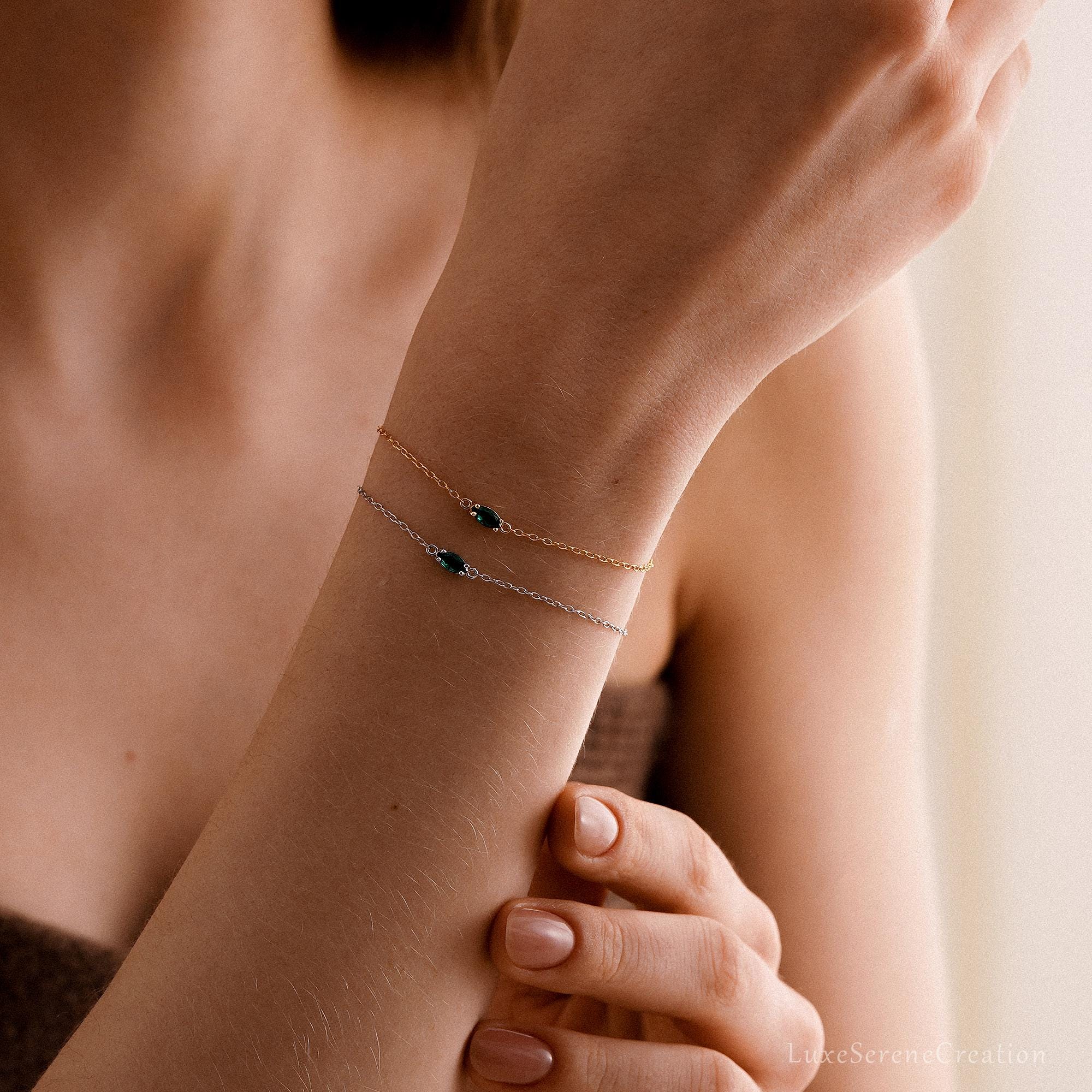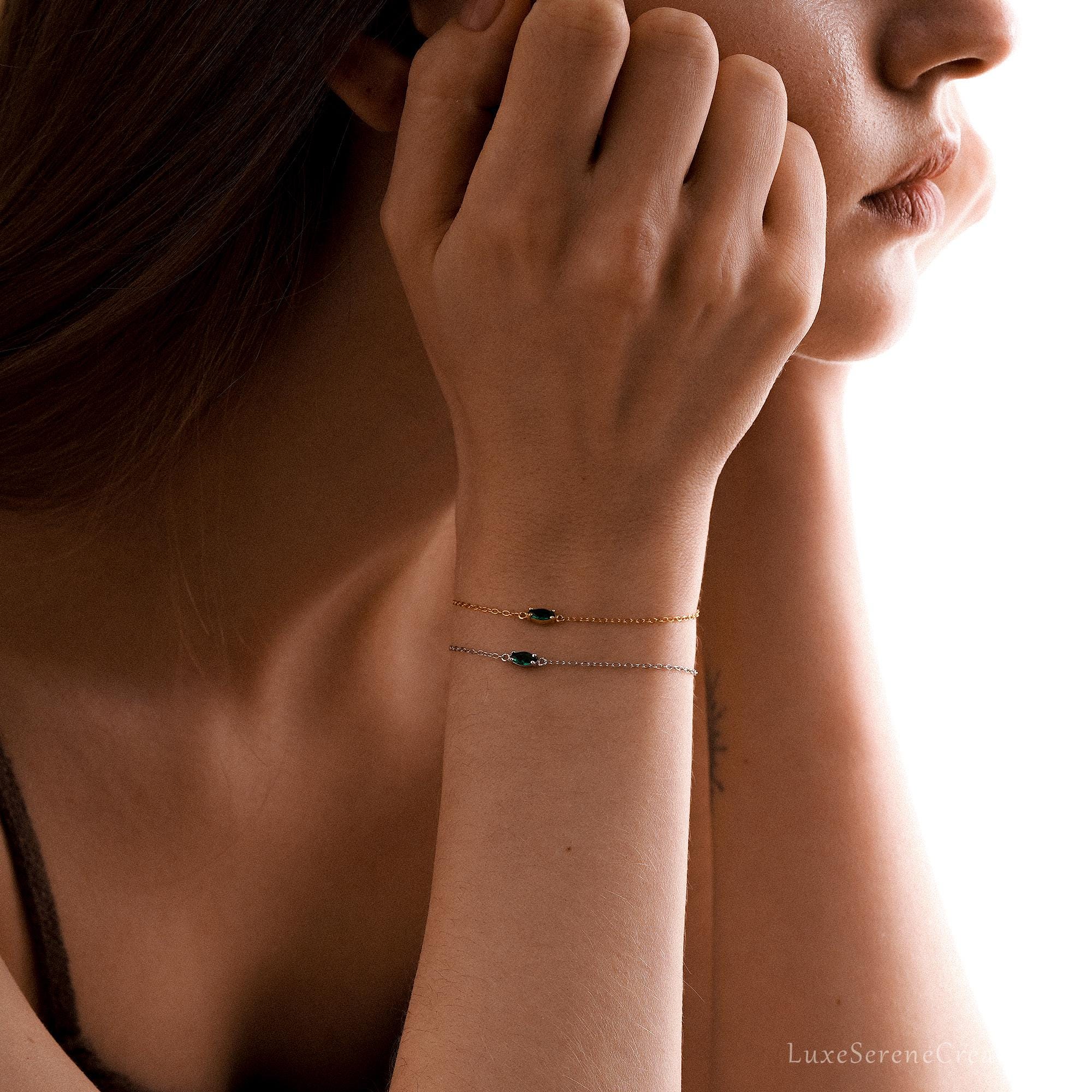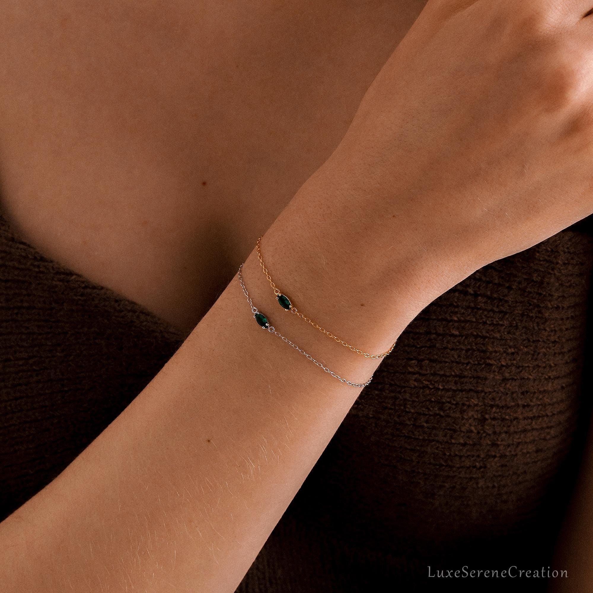 Emerald Gemstone Bracelet, Marquise Zircon Chain Bracelet, Sterling Silver Bracelet for Women, Birthday Gift, Mothers Day Gift for Her